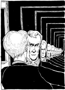 5. “Midnight in the Mirror World” (1964) – A man notices a woman wearing a veil placing her hand on his reflection in a mirror facing another mirror creating an endless stream of reflected images. The woman only appears in one of these reflections, however, and he looks fearful in that one. Whenever the clock strikes midnight, the woman appears closer to him in the reflection, then disappears after the chiming is done. He tries to figure out what prompts this mirror woman to appear and what will happen when she reaches the nearest reflection.