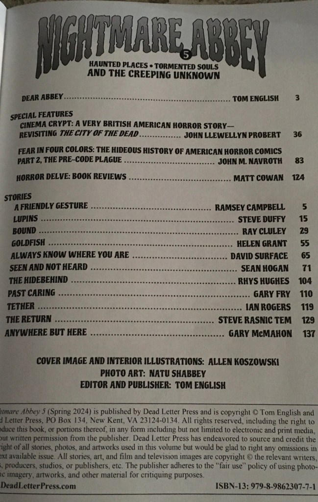 The fifth issue of Nightmare Abbey Magazine from Dead Letter Press is now available for purchase. Edited by Tom English, this one contains eleven short horror stories penned by top notch talent of the genre, including a brand new one by Ramsey Campbell.