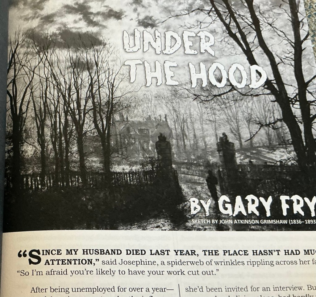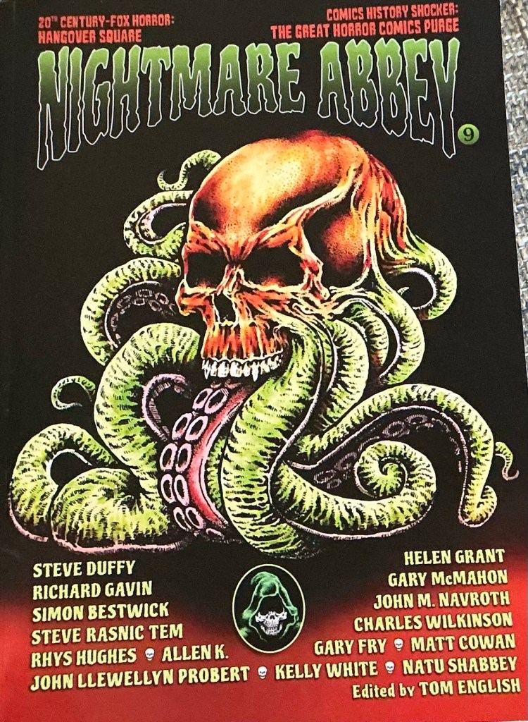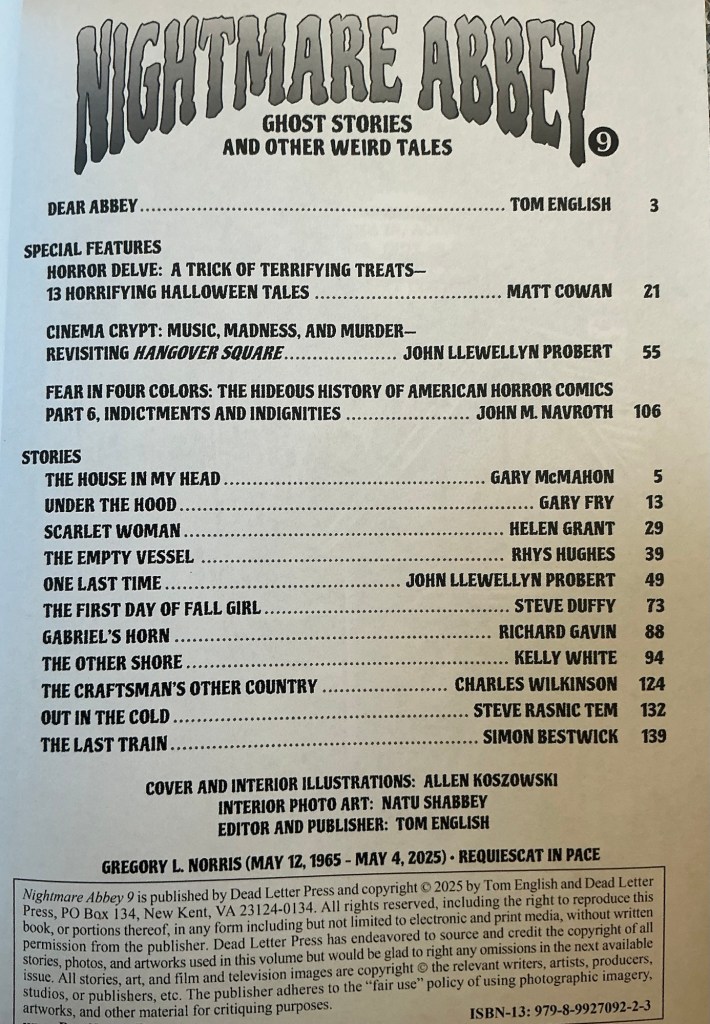Magnificent Cover Art By Allen Koszowski The Table of ContentsMore art inside by Allen Koszowski and Editor Tom English’s Dear Abbey Introduction Setting the Halloween ThemeGary McMahon’s “The House in My Head” is a superb, unique haunted house tale!In “Under the Hood” by Gary Fry, a cleaning lady’s new job tidying up a large secluded house leads her to a horrifying encounter.Helen Grant introduces us to the Scarlet Woman in her eerie tale.Magnus encounters the supernatural again in John Llewellyn Probert’s “One Last Time”It’s always exciting to have a new Steve Duffy story to delve into. This time it’s “The First Day of Fall Girl” John Llewellyn Probert returns again with his Cinema Crypt segment looking into the film Hangover SquareThe legendary Steve Rasnic Tem brings us his new story “Out In The Cold”John M. Navroth’s examination of The Hideous History of American Horror Comics continues here with Part 6Charles Wilkinson offers up his story “The Craftsman’s Other Country”Kelly White makes her Nightmare Abbey debut with her story “The Other Shore”