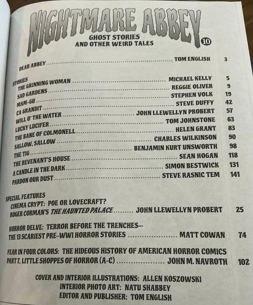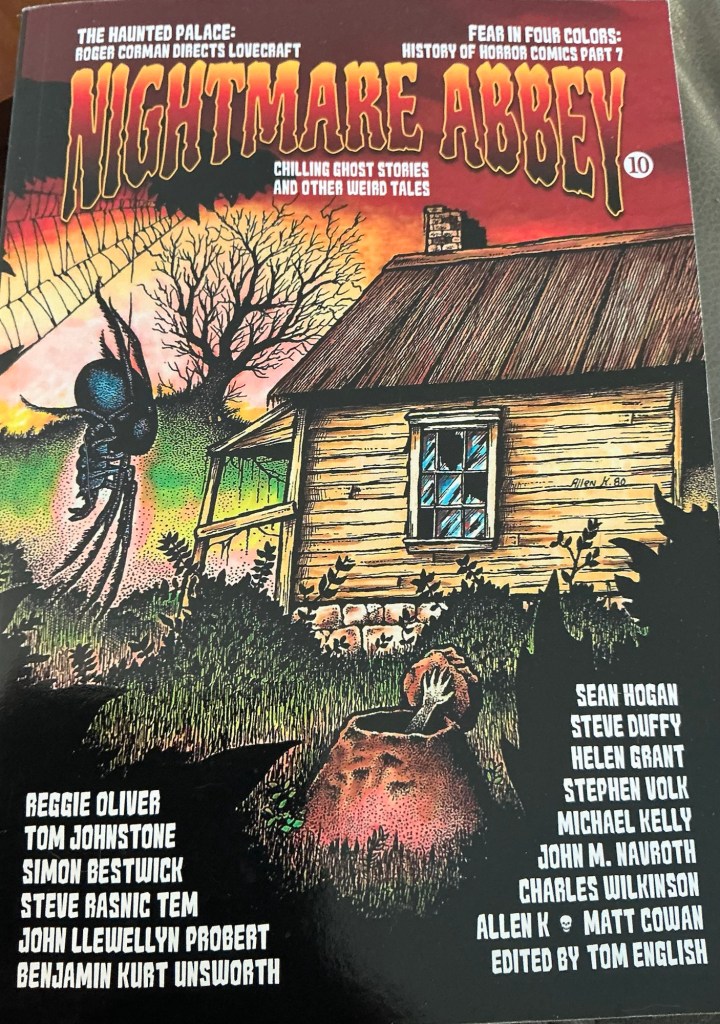NIGHTMARE ABBEY MAGAZINE has risen yet again to gleefully haunt those areas of your mind which crave the macabre. Every guest room has been filled by returning favorites as well as some new initiates. One of those new to The Abbey happens to be a personal favorite of mine in the form of legendary horror scribe Reggie Oliver. I’m excited to read his brand story, Sad Gardens. Keeping Reggie company in the Table of Contents for this issue are Tom Johnson, Sean Hogan, Simon Bestwick, Steve Duffy, Steve Rasnic Tem, Helen Grant, John Llewellyn Probert (both with a new story and a new installment of his Cinema Crypt movie review column), Stephen Volk, Michael Kelly, Benjamin Kurt Unsworth, Charles Wilkinson, John M. Navroth (continuing his look a The Hideous History of American Horror Comics feature) as well as an introduction by Editor Tom English (or does his usual Dear Abbey hosting job get usurped by an unexpected visitor this time around?). Artist extraordinaire Allen K’s work is featured throughout as he gives us a face-to-face look at things more at ease lurking after us in the shadows.